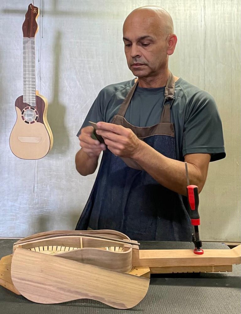 Abraham Marrero is one of the most recognized traditional musical instrument makers on the island of Tenerife. Always linked to the world of Canarian folklore, the brand Abraham Luthier offers a wide range of instruments (timples, contras, lutes, bandurrias, cuatros, and classical guitars), with the most extensive catalog in terms of features, woods, and tonalities. Abraham Marrero’s family tradition dates back to the time of Maestro Andrés de Lanzarote, Abraham’s great-grandfather, a renowned timple maker. His son, Andrés Albornoz, inherited Maestro Andrés’ technique and wisdom. Today, Abraham carries on this tradition and modernizes it, contributing to the evolution of the timple in the 21st century.